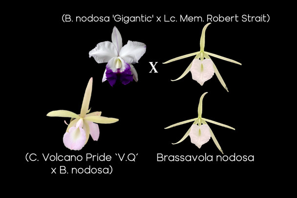 (B. nodosa 'Gigantic' x Lc. Mem. Robert Strait) , (C. Volcano Pride ‘V.Q’ x B. nodosa), (B. nodosa 'Gigantic' x B. nodosa)