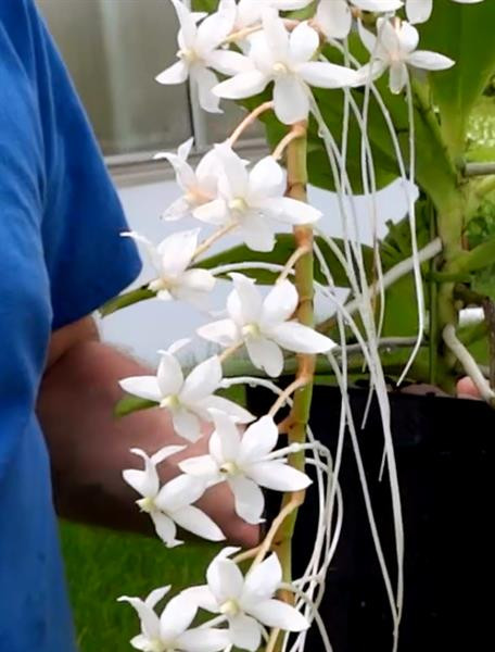 Another fantastic pendulous blooming angraecoid that is fragrant at night. Long spurs on white flowers. Each spike can produce 20+ flowers.