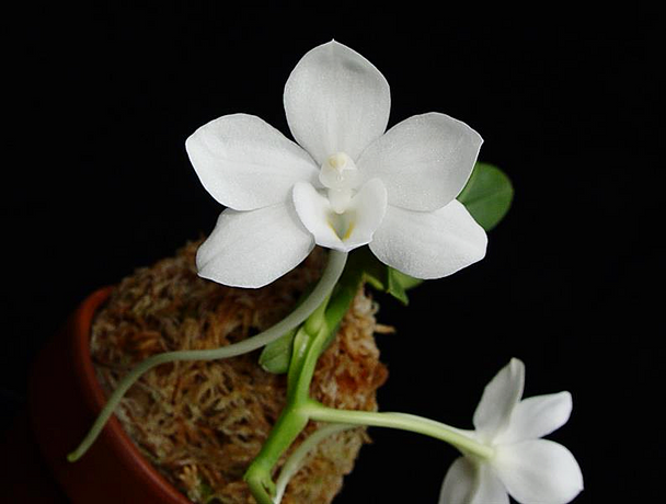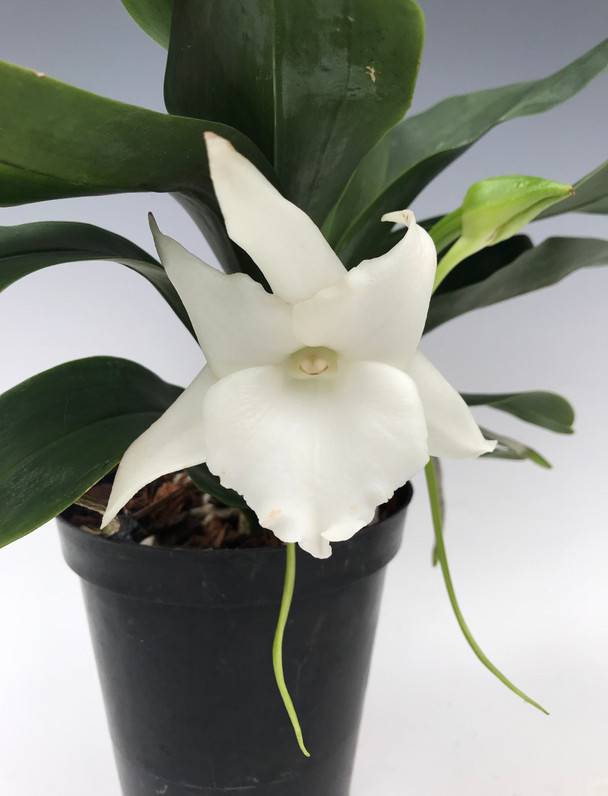 A very fine hybrid cross. The flowers are large but more rounded than sesquipedale and the plant exhibits the best habits of the two species being compact with wide, rich green leaves. The incredibly waxy flowers have superb fragrance at dusk and during the night with a sweet scent that has overtones of nutmeg. These are really magnificent large plants. Grow in medium light and water as the potting mix approaches dryness. These typically flower in late summer to fall.
