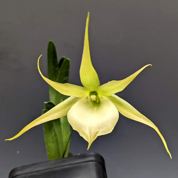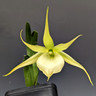 This novelty hybrid made in-house blooms with an excellent 4" wide flower with an emerald green to lime-yellow complexion. These plants stay relatively compact and are easy to grow. That being said, this can be a challenging orchid to flower. It seems to prefer cool to intermediate temperatures and bright light in order to bloom. For a majority of the year, this orchid is enjoyed as an ornamental plant, for is vigorous growth and upright growth habit.