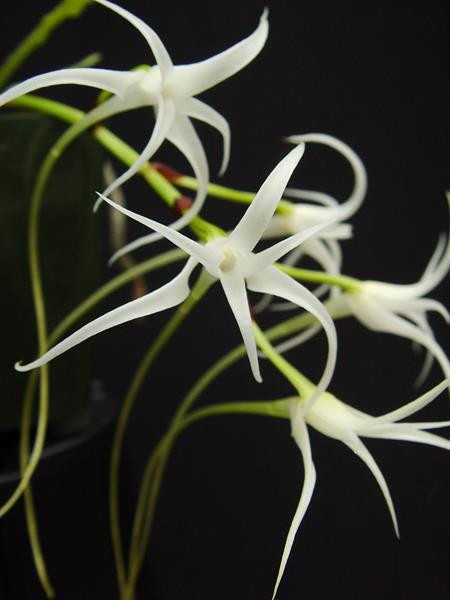 Native to western Africa (Gabon). This plants can get fairly large over time but well worth growing, as when the plant gets larger in size, the 7-10 flowered racemes produce quite large flowers similar in size and coloration to Aeranthes henricii. The only exception being that the flowers turn apricot in color with age. Likes drier conditions in winter.