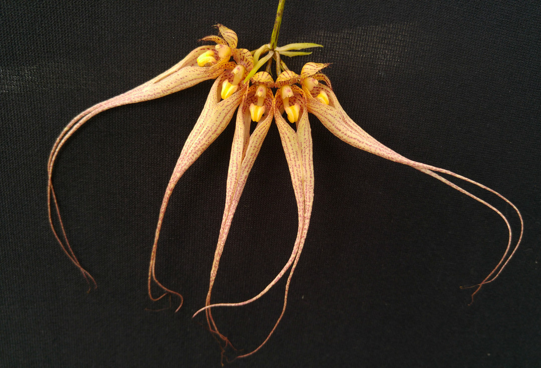 This orchid is the product of crossing two primary hybrids, resulting in 50.0% B. longissimum, 25% B. ornatissimum, and 25% B. rothschildianum genetics. The flower therefore carries a strong resemblence to B. longissimum, with a larger, more dramatic lip thanks to B. ornatissimum, and an overall larger flower size and deeper color thanks to the B. rothschildianum influence. This orchid exhibits typical hybrid vigor, with a rapid growth rate and an easy flowering habit throughout the year.