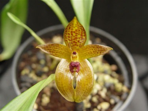 A rare species with large flowers that are greenish-yellow with an overlay of red veins and splotches. Dark red lip. Rare. From Borneo. Blooming size. Very limited.