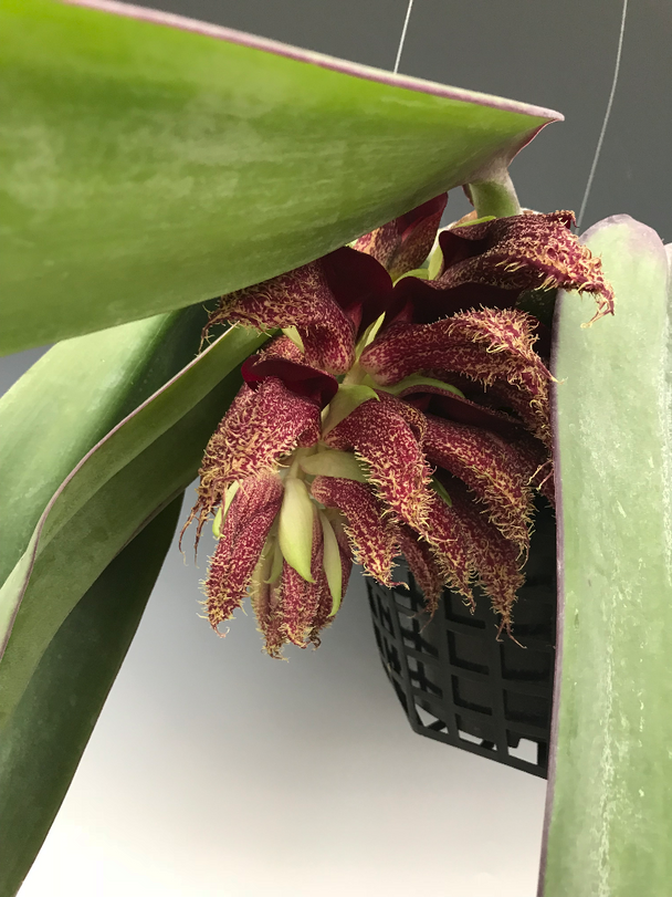 Native to Papua New Guinea, this species is the largest of the Bulbophyllum! This species gets its name from having foliage (not flowers) that are similar to Phalaenopsis. Well known for its long leaves and clusters of red, hirsute, stinky flowers. The first photo shows an example of this orchid's flower.