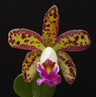 A compact hybrid that bears flowers on 5" growths. The rhizome produces new growths immediately after the old growths, making for a tightly culstered compact mini catt.