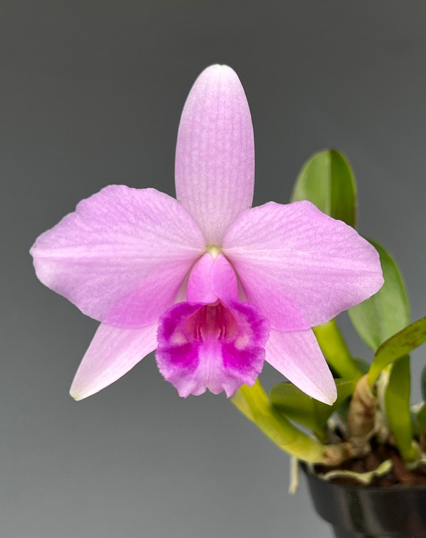A petite, compact primary hybrid resulting in a lovely mini-catt that reaches blooming size at the 3" pot size! The flower measures about 2.75" (7 cm) across. Miniature Cattleya do not need as bright of light as large Cattleya, so we recommend growing in medium light levels. This hybrid would also grow well mounted.
