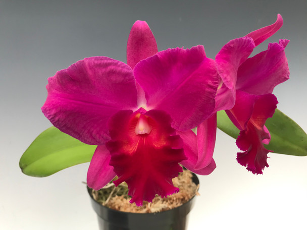 This is a cross we made to produce vibrant reds. They have all flowered out with very nice red flowers with a darker scarlet red lip. The flowers are between 4 and 5 inches in size, have good substance and an amazing fragrance. These also flower twice per year in fall and spring.