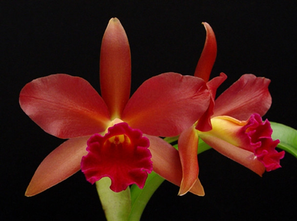 A beautiful copper to red colored flower with an intense velvet red lip.