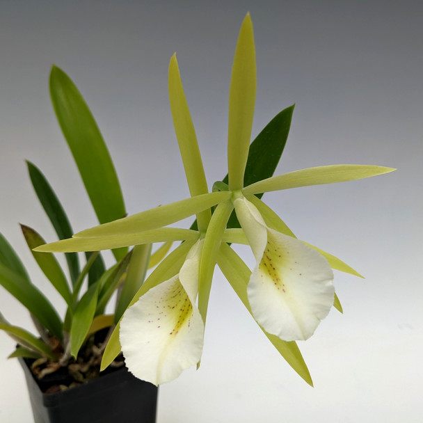 This hybrid delights with key lime-green flowrs that last 4 to 6 weeks! Brassavola Hybrids are some of the easiest of all orchids to grow and are perfect for beginners. Grow in good strong light and allow the potting mix to become just dry between watering. The flower spikes emerge first inside a sheath at the base of the inside of the leaf where it joins the supporting stem.