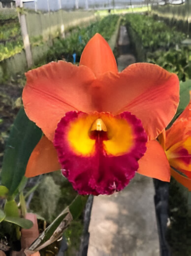 A brightly colored, fragrant Rhyncholaelio cattleya hybrid.