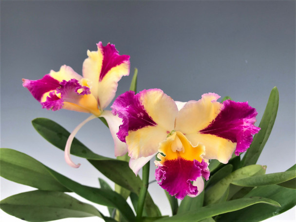 This is a very nice colorful bifoliate Cattleya that can flower a couple of times a year with 2-5 flowers per spike. The growth habit is pretty tight with not a lot of distance between the pseudobulbs. The plants offered are large, well grown plants. These typically bloom in the spring and fall. There is a light fragrance. This is a nice splash petal cross with lighter yellow petals and sepals with deep magenta flares at the tips and a darker yellow lip with a scarlet interior changing to magenta at the tip of the lip.