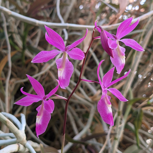 Native to Mexico, this species grows epiphytically atop rocks and attached to trees or small bushes. In the fall through winter, it sends out a terminal flower spike that blooms with up to 18 bright purple flowers. After completing its flowering cycle, a new growth will begin to emerge from one of the plant's side nodes.