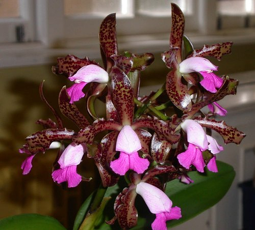 Cattleya tigrina is a superb form of leopoldii that is shorter in growth habit and has very dark mahogany colored flowers with darker red markings. The flowers have a laquered look to them and can be quite numerous with as many as 50 flowers on a spike when mature.