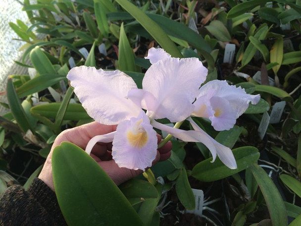 A unique form with light blue flowers and a yellow labellum. This spectacular winter-blooming species is native to Colombia and has the longest lasting flowers of any Cattleya, often lasting for up to 6 weeks or more. The large, fragrant flowers are stunning with their 6" to 8" size. The flowers have a crystalline look to them and sparkle in the light.