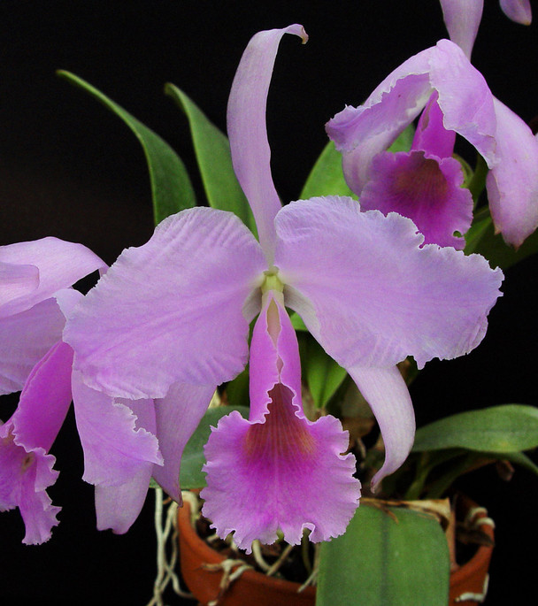 Select divisions of this cross between two trianaei varieties. This spectacular winter-blooming species is native to Colombia and has the longest lasting flowers of any Cattleya, often lasting for up to 6 weeks or more. The large, fragrant flowers are stunning with their 6" to 8" size. The flowers have a crystalline look to them and sparkle in the light.