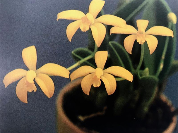 A beautiful rupiculous laelia native to Minas Gerais growing at an elevation of 1100-1200 meters. These laelias (now Cattleyas) grow in crevases in granite with their roots diving into peat-like build up in the crevases which always have some moisture. These are potted in New Zealand sphagnum moss so always allow the moss to just dry between watering. The brilliant 1" yellow flowers with a somewhat darker lip emerge mostly in spring and last well. Keep the potting material slightly more moist when in bud or flower.