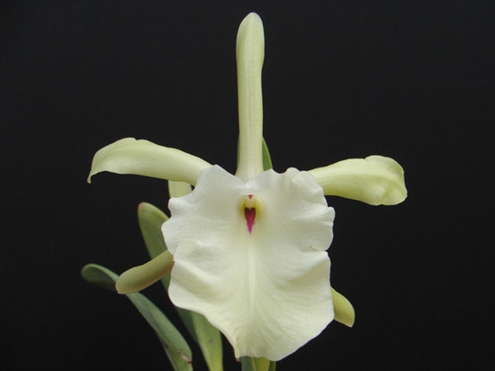 Rhyncolaelia glauca’Pale Jade’ AM/AOS is related to Cattleya and native to Veracruz, Oaxaca and the Chiapas states of Mexico, Guatemala and Honduras. The pale green flowers are nicely formed with a brilliant red marking inside the lip.