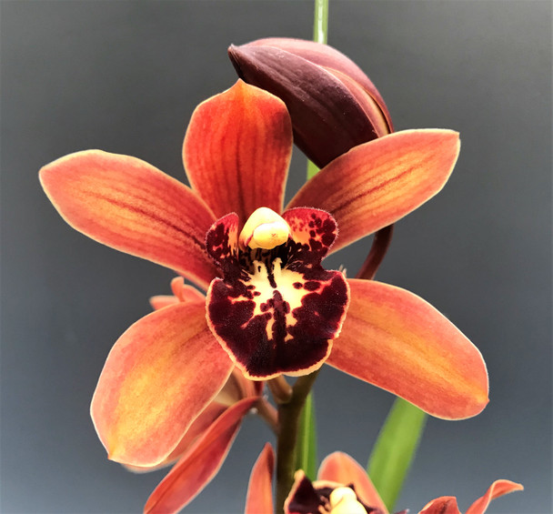 This is a beautiful orange mini Cymbidium that is warmth tolerant. Grow in medium to high light and water as the potting mix approaches dryness. These plants like to be outside in the summer months. Keep them somewhat shady at first when putting the plants out. Gradually increase the light levels. Bring the plants inside once the night temps drop into the upper to mid 40's. The flowers last 2-3 months and have a light fragrance.