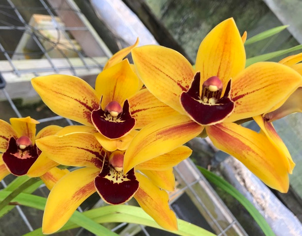 A warmth tolerant miniature Cymbidium with deep yellow 3-4" flowers and red markings in the petals and sepals. Very dark burgundy red lip. Fragrant.