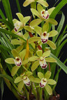 Lovely miniature cymbidium colored in pastel greens with burgundy in the lip. Multiple spikes.