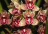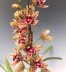 An unusual colored miniature Cymbidium with 2-3" flowers cored in Yellow with burgundy/ red markings. One of the warmth tolerant Cymbidiums. Keep in bright light and water as the potting mix approaches dryness but still maintains some moisture. These plants spike up in the fall and usually flower in the winter/spring months.