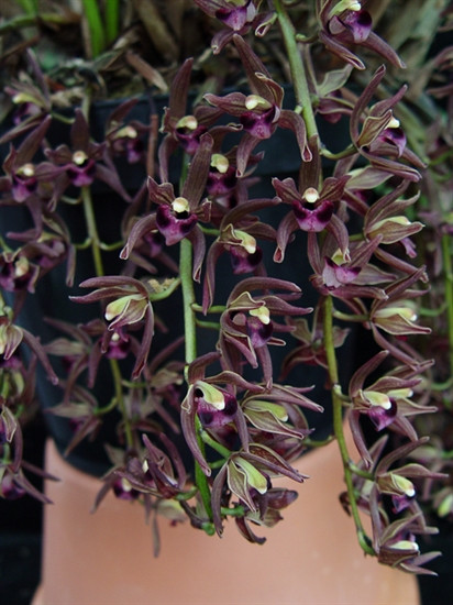 Named for the Duke of Devonshire, this indian species has 10-12 inch long leaves that are broad and blade like. The flowers emerge in the spring after a slightly dry rest with no feed in winter. The scapes are pendulous with 15 to 25 flowers that are nearly 2 inches in size. The flower color has a green base overlaid with olive and a bit of burgundy spotting and striping. The lip is white dark wine colored spots on either side of the column. Fragrant like eucalyptus.