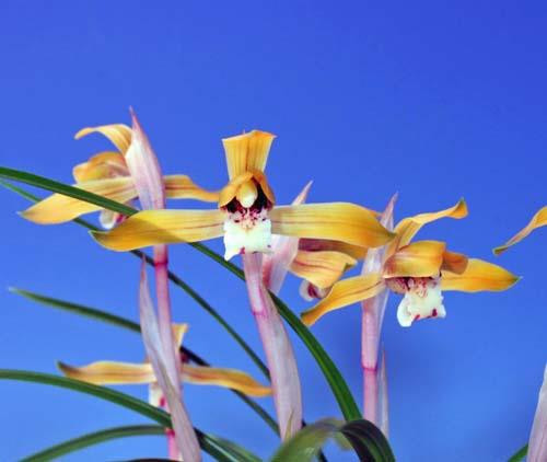 In the fall, goeringii will produce flower buds at the base of the plant. During this time the buds can be covered. The most unique technique used in Japan is to place a fine mesh screen around the surface of the pot that bows up from the rim to the center of the foliage. Then cover the mesh with a fine grit substance like coarse sand for about 1 month. After 1 month, remove and the buds should be larger but not pushing out of the medium. At this stage a paper or aluminum foil tube about 8" high is placed over the bud with the top closed to prevent light from coming through to the bud. Now the spike will develop in the tube, which can take up to 50 days. During this spike development time, the best temperature range is above freezing but below 50 degrees F. This technique is what the best growers use in Japan for maximum color, however, we have flowered some varieties without doing any of these steps. We do keep the plants below 70 and above 55 degrees in the particular greenhouse they grow in (winter time), and have mixed results in blossoms.