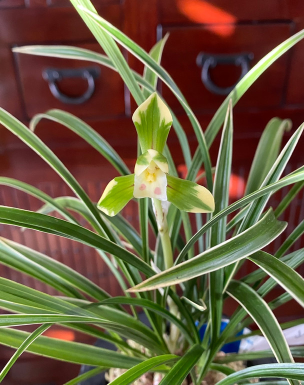 It has a hite margin along the edge of the foliage, which also matches on the edges of the green petals. 'Setsuzan' is one of the few goeringii that can flower without a long cold rest, and is the go-to plant for someone who doesn't want to go through the fuss of the strict flowering regimen that many other varieties require. They also have a very subtle and nice ethereal fragrance.
