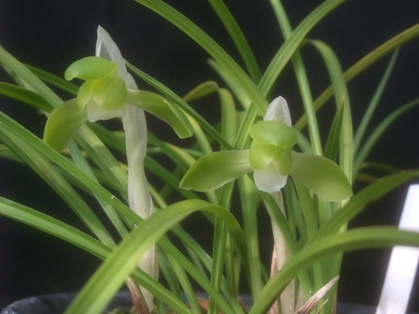 A Japanese goeringii with very thin, slender foliage and albino flowers.