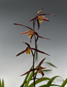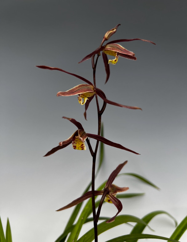 Cymbidium kanran are native to North Vietnam and South China. They are cool growing Cymbidium yet are easier to flower than goeringii. They produce multiple flowers with slim, pointed petals and dorsals. They also have a nice fragrance somewhat similar to musk. These orchids tend to have larger leaves and bulbs than most of the other Jensoa subgenus Cymbidiums. These come in a wide variety of colors, and this batch has a maroon color to it.