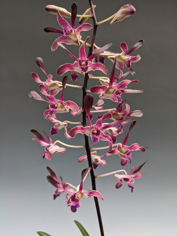 We are offering a selection of random, blooming-size antler-type Dendrobium hybrids. Most of these hybrids produce flowers in shades of purple to fuchsia as the example photo shows.