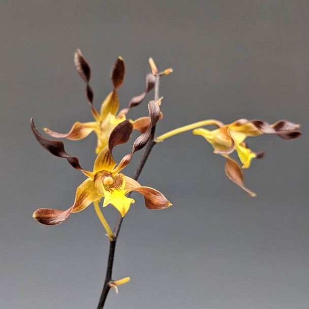 An intricate antelope-type hybrid that blooms with twisting chocolate-colored flowers. A compact grower that stands at 12 inches when not in-spike, this is an excellent option for those growing in tight spaces.