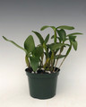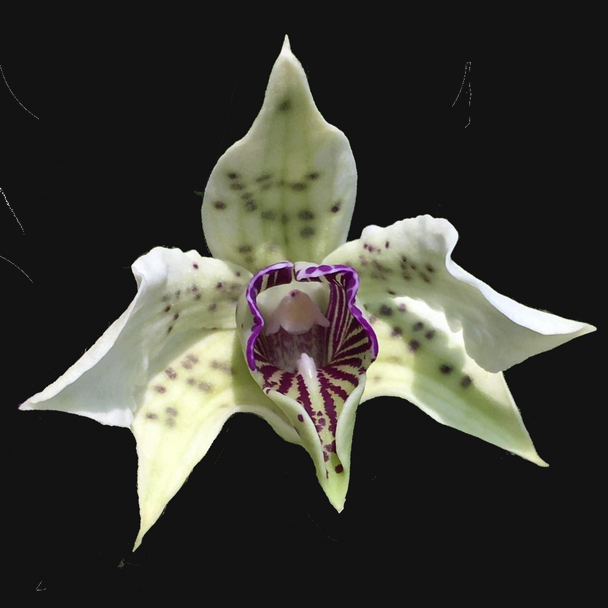 This dendrobium hybrid has pretty creamy greenish - white flowers dotted with dark purple speckles on the petals and deep purple stripes in the lip.