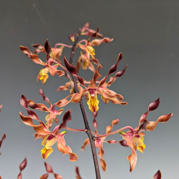 An intricate antelope-type hybrid that blooms with twisting orange-to-pink-colored flowers. When not in bloom, the upright growths make for a stately houseplant.