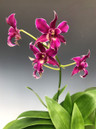 This is a hardy Dendrobium from the Latouria section that can bloom multiple times a year. It grows best in medium to bright conditions. These flowers have white edges. This plant can flower more than once per year and each growth can flower 10 or 15 times over its lifetime. The long lasting flowers are a deep burgundy purple.