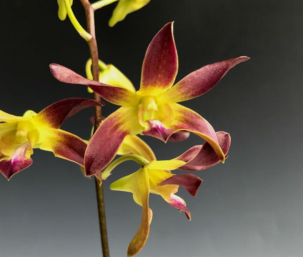Beautiful red to pumpkin-colored 3-inch flowers that last 2-3 months. This hybrid can flower twice per year. A compact growth habit makes this plant desirable to grow and flower. Grow in medium to high light, watering the potting mix just as the mix approaches dryness.