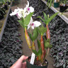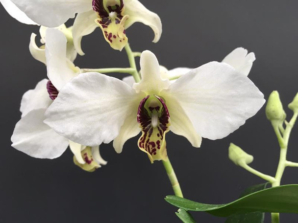 This Dendrobium hybrid is a Dendrobium hybrid between Den. Roy Tokunaga and Den. Silver Wings. This hybrid is in the section Latouria (also known as a New Guinea Dendrobium). The large flowers will be pure white with various degrees of purple stripes and marks in the lips. These particular plants are somewhat larger than Den. Roy Tokunaga and will easily become specimen plants with flowers that will be long-lasting on upright spikes. They are free blooming and can bloom twice per year. Each spike can bloom up to 3 times. The flowers have lasted 6-7 months on each spike! The flowers are lightly fragrant.