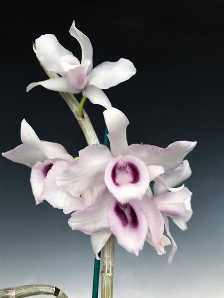 This is a form of Dendrobium that loses its leaves in winter and flowers out all along the cane. To grow these correctly, water and feed well when actively developing new growth. Stop feeding from late November until the plant has finished flowering and is developing new growths. Watering frequency can be reduced without using fertilizer, and make sure the medium never stays moist for long periods of time. Usually occasional misting is enough. Once the buds start appearing water as the potting mix approaches dryness.