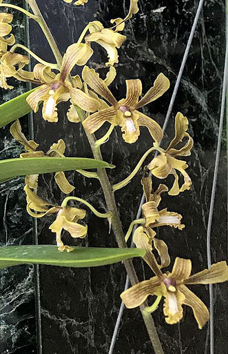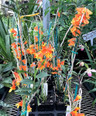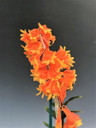 This species is native to New Guinea growing at 800 meters in elevation. You can stake the growths and grow them upright, or hang the pot at an angle (or mount on a slab) and let them grow pendulous. The plants offered are larger flowering-size plants. Handsome candy-corn colored flowers emerge in groups of 2 to 5 opposite the leaves and can cover the canes. The flowers are very showy, brilliantly colored in orange and yellow and are fairly long-lasting. Grow in medium light and water as the mix approaches dryness. The leaves will often fall on some of the canes and flowering will occur shortly thereafter.