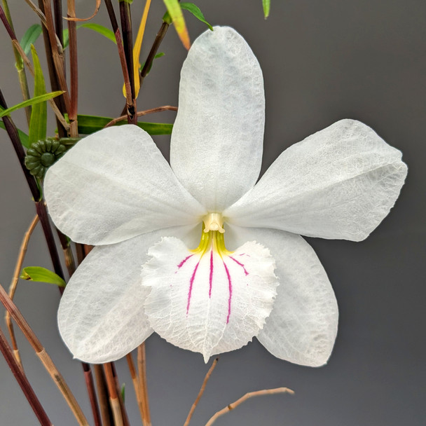 The wild-type form of this species, native to the Philippines, typically blooms with small, star-shaped flowers. However, through multiple generations of select breeding, we have developed a large-flowered form that we refer to as "Fischers Strain". This orchid produces beautiful canes up to 3 feet tall, which can be staked up if potted or hang like a living waterfall if mounted on a cork slab. Despite having very thick roots, this slender-leaved orchid is sensitive to drying out and should be watered as soon as the potting media becomes lightly damp to the touch. This orchid is naturally deciduous and will drop leaves off of the oldest growths, which are quickly replaced by the emergence of new growths. We have been carefully cultivating these plants since 2017 from seed.