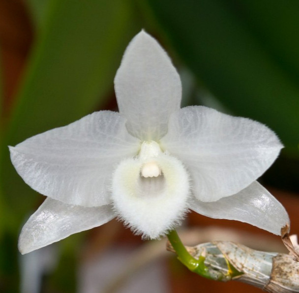 The tetraploid 4N (larger flowers than standard) pure white form of this lovely species. It produces stalky and pendulous growths (about 1/4 the length of mature anosmum) and fragrant flowers. A widespread native to SE Asia. It grows well in baskets or on slab mounts. We currently have them growing in 2.75" square pots with moss. They should reach first blooming size by late 2023 to 2024.