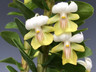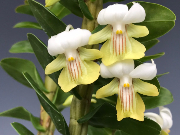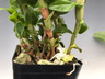 Native to a wide swath of Southeast Asia this hot to cool growing epiphyte has one inch pastel green and white flowers with three to five red stripes in the center of the lip. The canes can get tall with time and the leaves are arranged in a perfect plane going up the canes. What is really nice about this species is that it is flowering basically year round putting out flowers all along the canes over a long time period and often in clusters of 2-6 flowers at a time. This plant is continually growing throughout the year. It is a really easy plant to grow and flower. The present plants are 10-15 inches tall. These can even flower at the base of the growths. The flowers have a nice spicy fragrance.