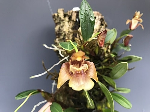 Native to North Vietnam, growing in cloud forests, this intriguing miniature species has a rambling growth habit similar to that of Diplocaulobiums and some Bulbophyllums. The flowers are proportionally large (1") compared to the growths and unique in their form, despite their unassuming coloration. This species is grown best mounted on cork slabs at intermediate temperatures but can be grown in cool to warm temps as well. This species is slightly fragrant. The plants currently available are all rooted divisions from our mother plant, offered in 3" pots.