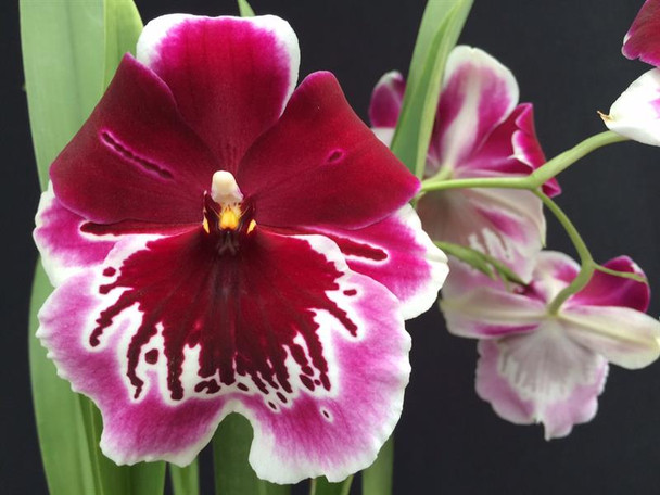 A very nice color form of this great hybrid. Deep black mask over a white, pink, burgundy and red background.