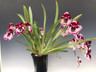 These are divisions of one of our stud plants. This awarded clone has petals and sepals that are white with fuchsia in color. The lip is white with a dark red to black mask with an extensive waterfall pattern.