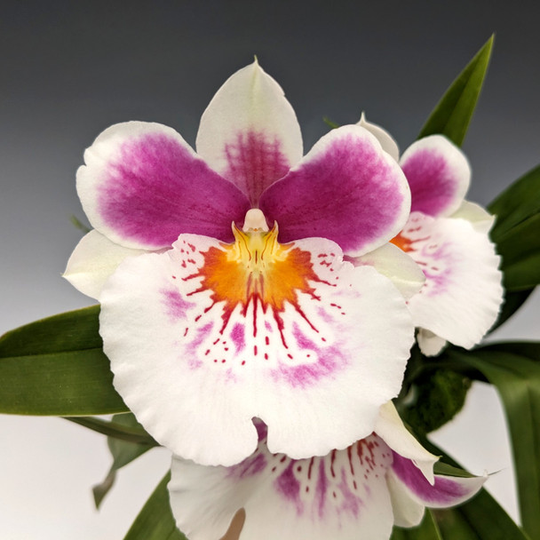 This beautiful hybrid blooms with dazzling 4-inch wide white and pink flowers that last about 3 weeks. Each plant in this cross is seed-grown, so the exact flower color will vary from one plant to another. Like with all large Miltoniopsis flowers, they will produce a sweet fragrance during the daytime.