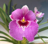 A pink Miltoniopsis hybrid with a white background in the center of the lip and a burgundy-red waterfall pattern in the upper area. The lower lip, petals, and sepals are a brushed rose color. Lightly fragrant. Grows best in moist, medium-light conditions. These plants prefer New Zealand sphagnum moss or a small- to medium-grade bark mix for best results.
