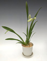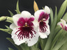 This beautiful Miltoniopsis hybrid blooms with large, white flowers accented by red waterfall patterns in the lip. Miltoniopsis are known to have a light, floral fragrance to them. Grow in intermediate to cool temperatures and water as the moss approaches dryness and is just lightly damp. Comes freshly potted in New Zealand sphagnum moss in a 4.5" decorative ivory-colored pot with a matching saucer.