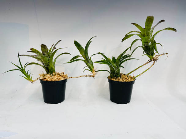 Small, fast growing bromeliad that produces pups prolifically. Native to Brazil. Purple bands and spots on silvery green leaves.