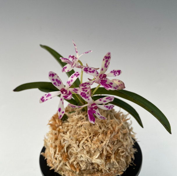 A semi-compact plant with the right combination of both parents. The flowers carry over the spots from the spotted form of Rhy. gigantea. Because of the Rhy. gigantea background, it is possible for the foliage can reach 8" or slightly longer over time. The can start blooming at a small size.